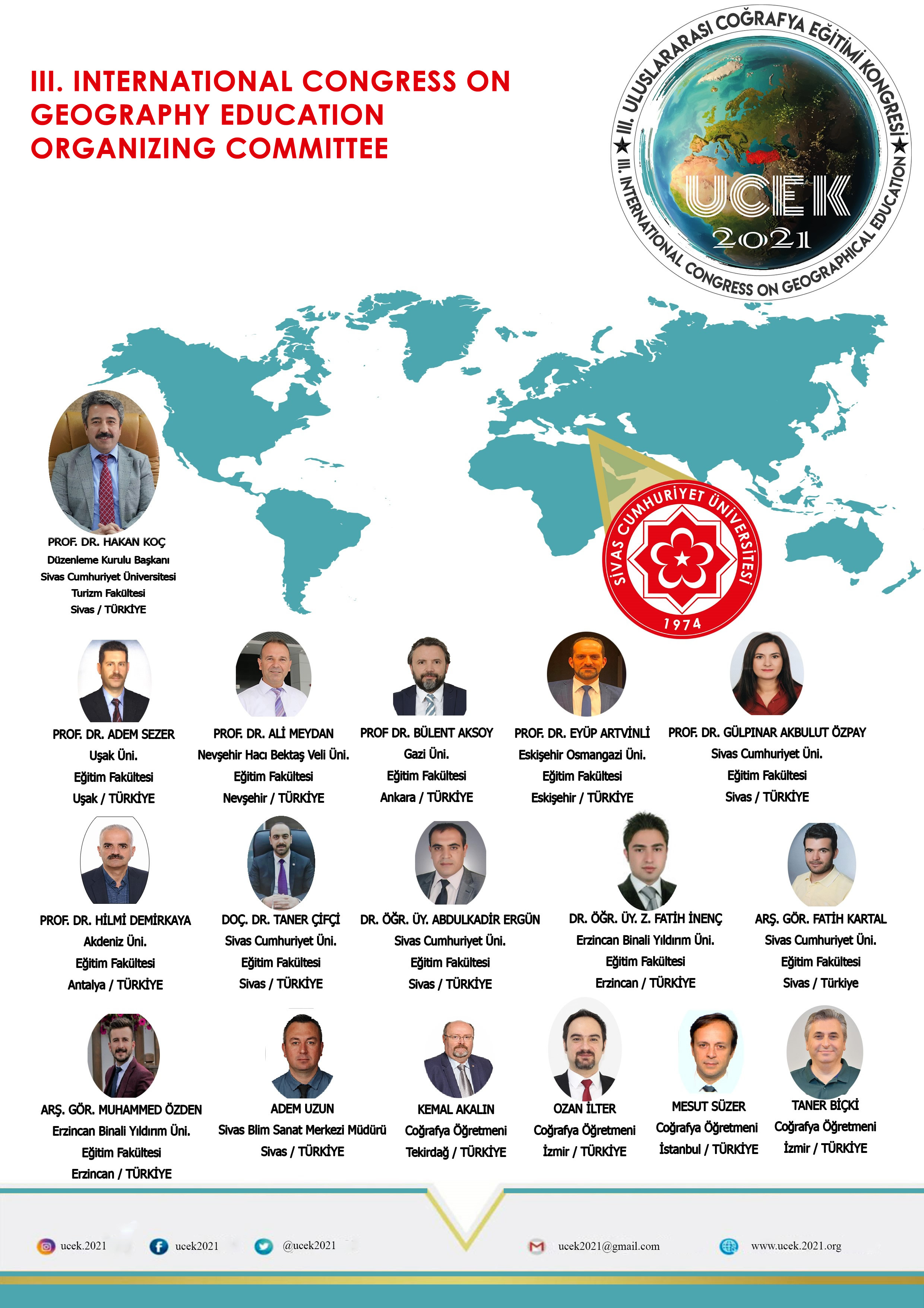 The common aim of the International Congresses on Geographical Education (UCEK 2018, UCEK 2019, UCEK 2020 (postponed due to the COVID-19 outbreak), UCEK 2021 ...), is to connect leading academics, researchers and decision-makers from the field to collaborate academically, and with integrity, to create a platform called “Powerful Geographical Education, Powerful Future”.